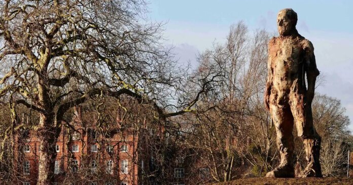 A massive bronze statue of a nude man, dubbed the East Anglia’s Angel of the North, has been causing significant traffic disturbances along a busy road where it stands. The 26-foot tall Yoxman has been attracting attention from passing motorists on the A12 in East Suffolk, raising worries about potential accidents. Located at Cockfield Hall in Yoxford, the sculpture, resembling a “wounded giant,” was crafted by artist Laurence Edwards, drawing inspiration from the nearby bogs and woodland.